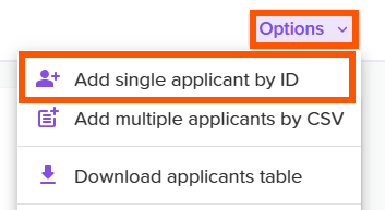 - First, click on the ‘Options’ button in the top right-hand corner of the screen and select ‘Add single applicant by ID’.